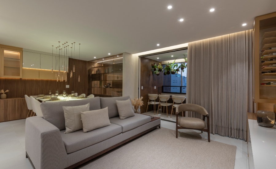 A sala de estar pode ganhar atmosfera fresca e acolhedora com tons claros e peças artesanais. A cozinha gourmet se beneficia de uma proposta clara, funcional e integrada ao living. As suítes ganham sensação de refúgio europeu com tecidos leves e iluminação suave. Já as áreas externas se transformam com elementos mediterrâneos como vegetação, pedras e móveis naturais.